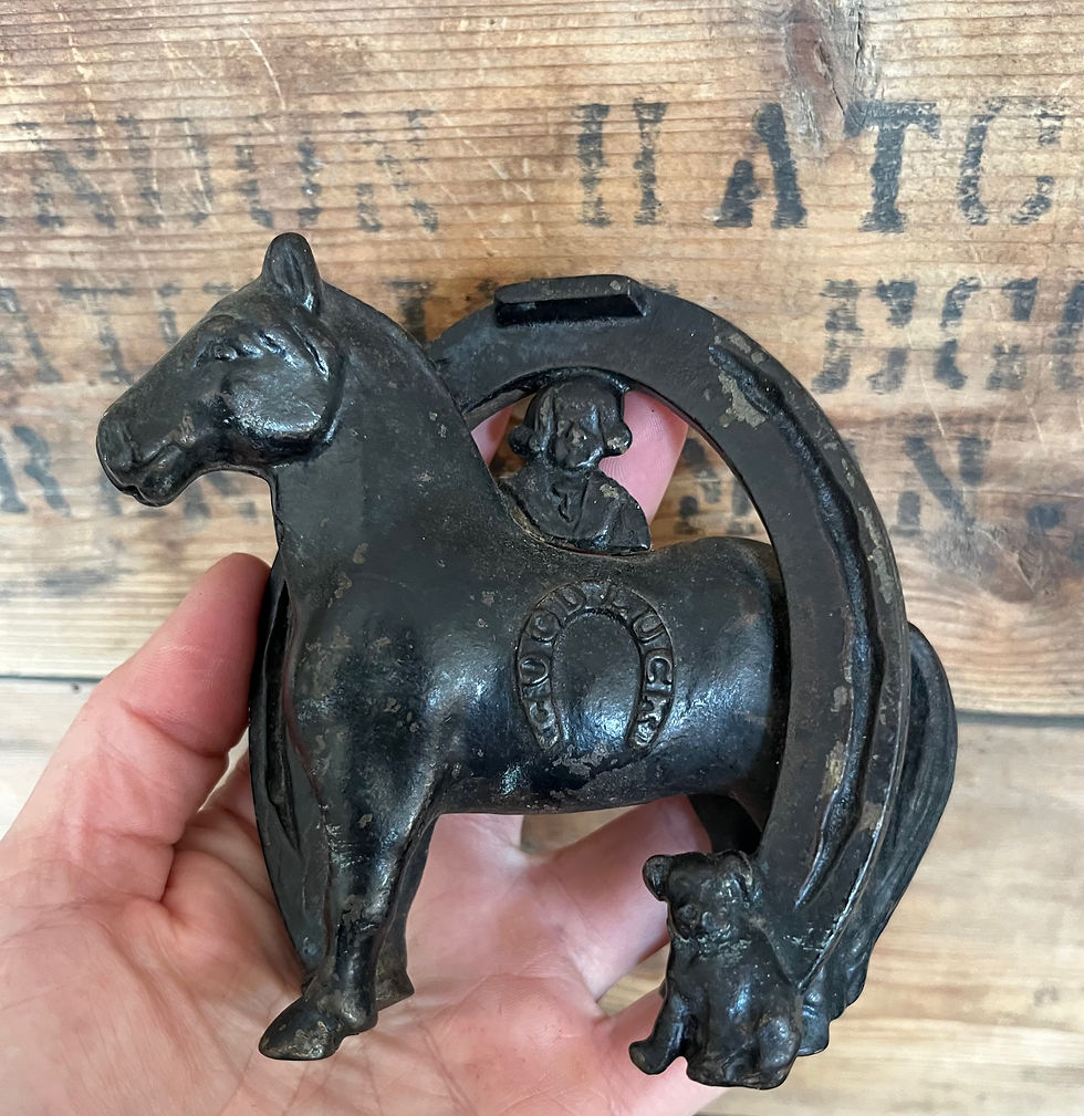 Arcade Cast Iron Antique Buster Brown Good Luck Horseshoe Tige Still Bank